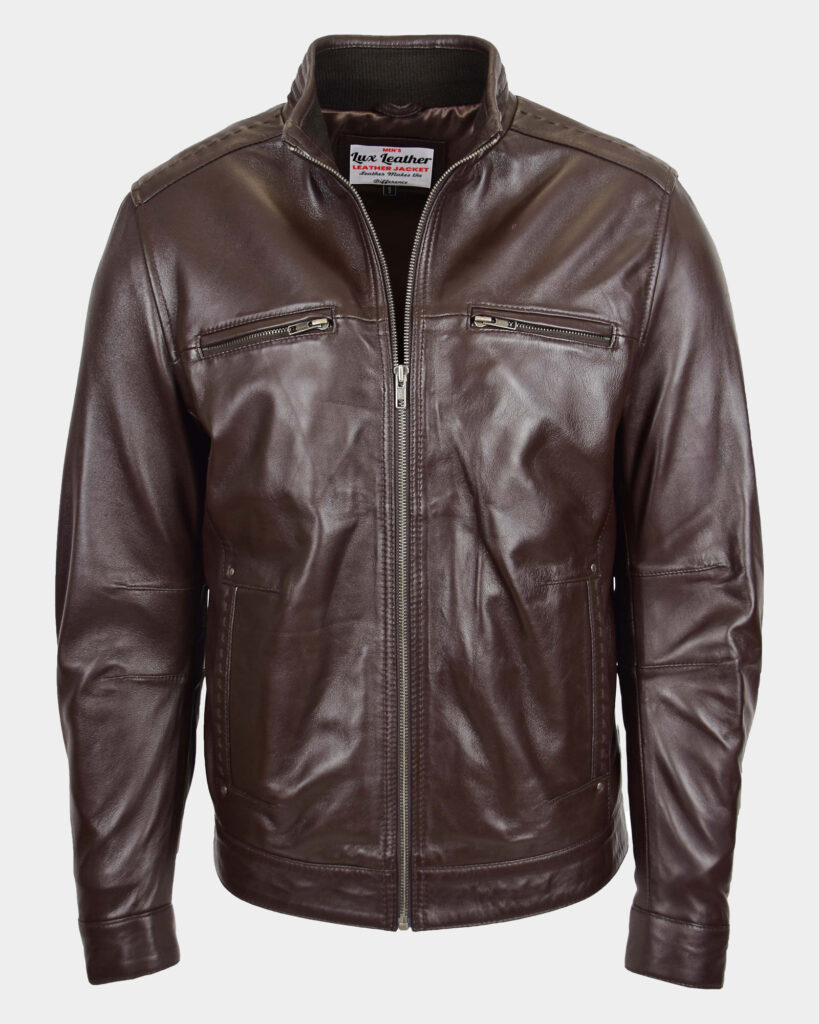 Men’s Standing Collar Leather Jacket Tony Zenith Brown